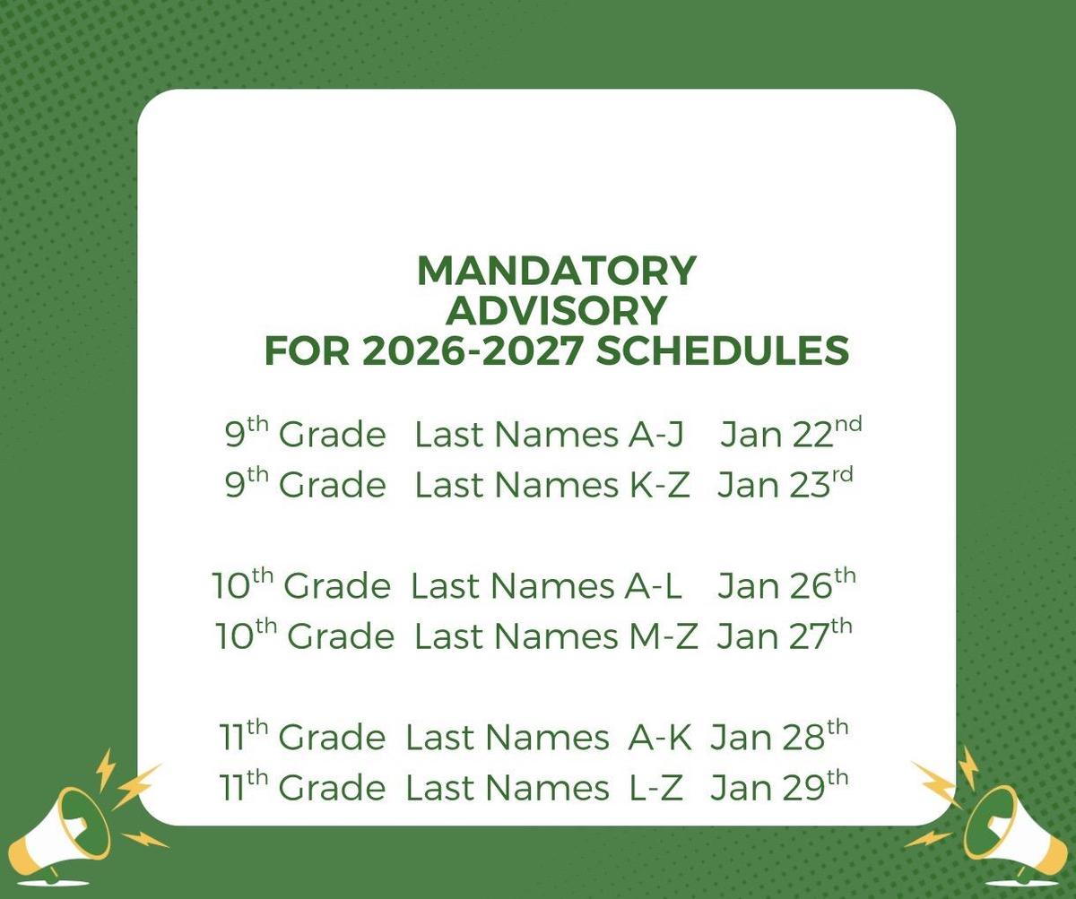 It is time to begin the course selection procress for the 2026-2027 school year. The course selection MANDATORY meetings will be held during the advisory period (7:45-8:15). The designated dates are provided below for each grade level. Pay close attention, each grade level is divided into two different days.